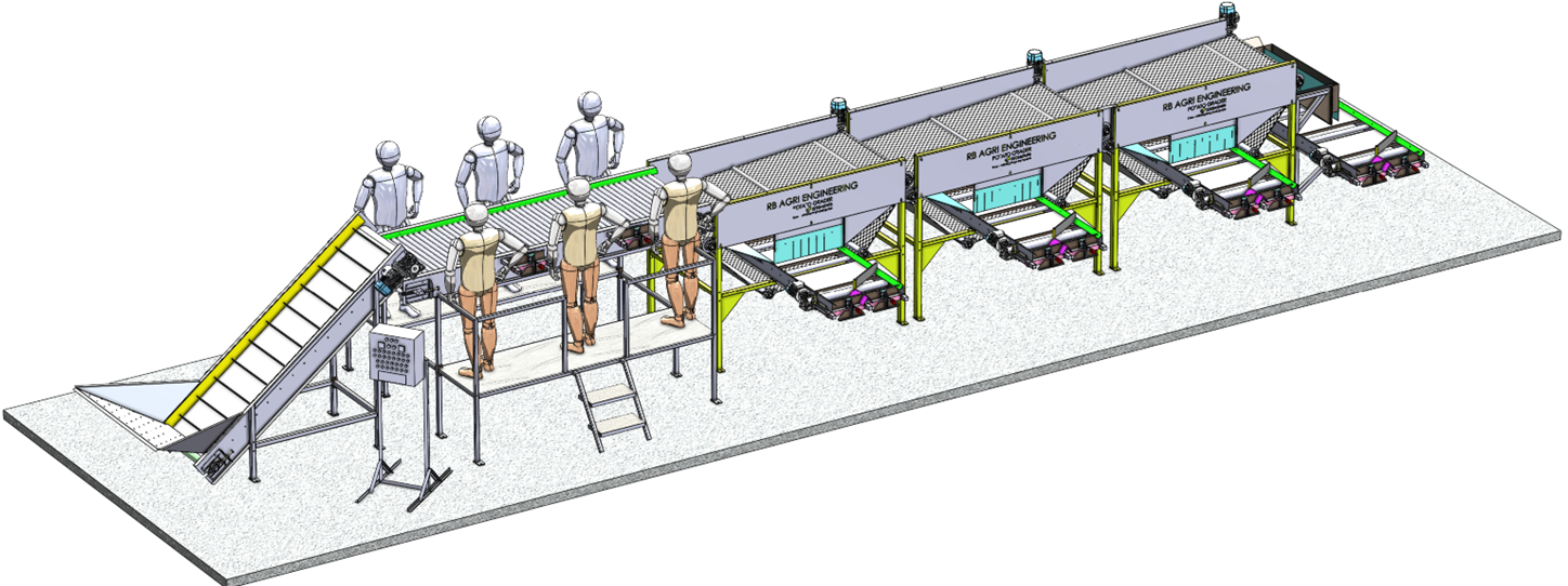The Potato grading machine is designed to separate over-sized, undersized, precise sized, seed size potatoes. This consists of hopper & elevator, inspection table, grading module and underneath conveyors.